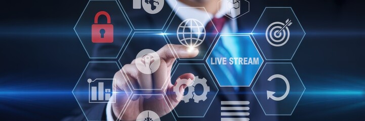 Businessman hand pressing a digital social network icon on a touchscreen interface to achieve global communication and business success through modern internet technology