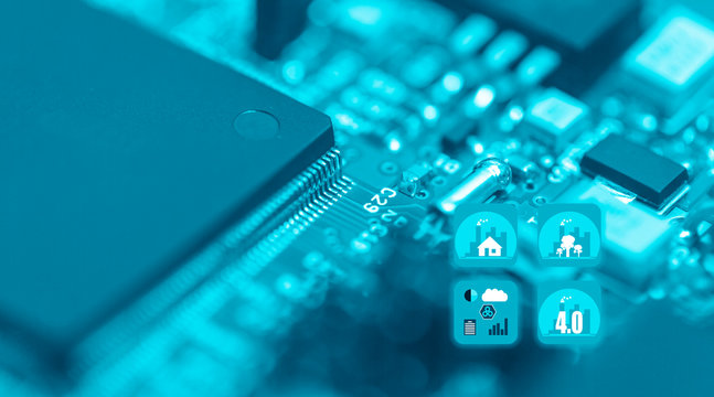 Abstract background of close-up details of electronic cpu chip with colourful  industry icon, concept of modern technology for better life, city and environment conservation.