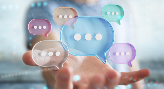 A vibrant digital interface featuring a glowing speech bubble icon against a backdrop of intricate data patterns and lines.