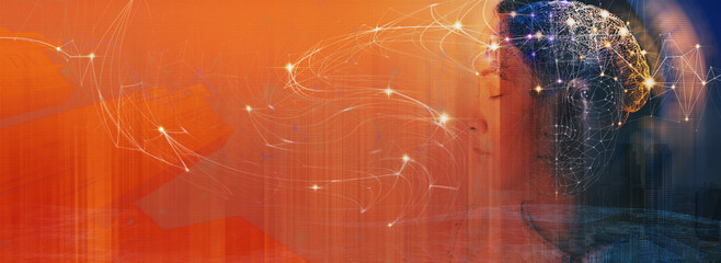 Double exposure of Woman thinking with The metaverse universe,innovation virtual brain and connection lighting brain and brainstorming concept