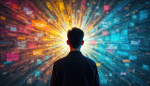 Student contemplates expanding mind map, grasping complex concepts. Digital data streams in vibrant colors flow outwards, learning, insight, connection. Progress, development, intelligence visualized.