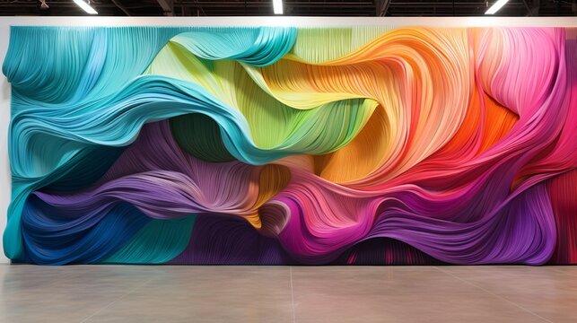 Immersive neon geometric line mural wrapping dark gallery with reflective polished floor