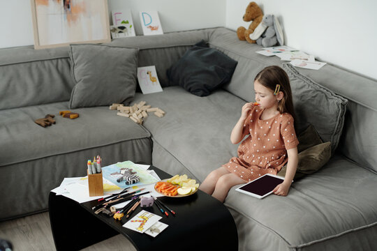 High angle of adorable little girl sitting on comfortable couch in front of table with crayons and papers and eating fresh carrot