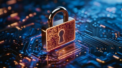 Glowing pink padlock icon in virtual network cybersecurity concept
