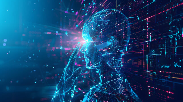 3d holographic interface with human silhouette and data flow, futuristic blue tones, glowing typography area, tech brand concept
