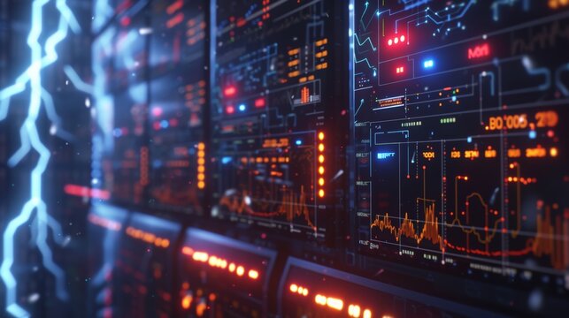 Data science and analytics concept. A neon led colored digital technology overlay or background. Futuristic hub interface concept. cyberpunk open space service office space interior blurred