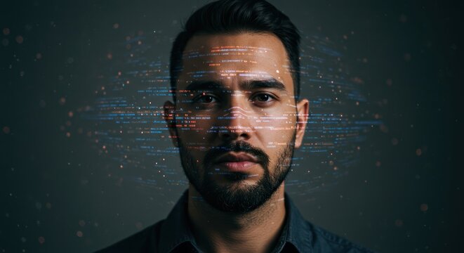 Digital identity portrait features a man's face with red and blue data overlays, suggesting a futuristic, connected, and technological concept.