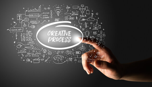 Hand touching CREATIVE PROCESS inscription, hand drawn icons around, business plan concept