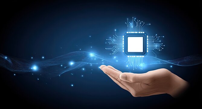 Advanced technological interface: glowing orange circuits on a blue device, symbolizing complex data flow and cutting-edge digital processing.