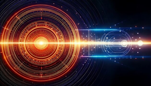 A futuristic, digital abstract artwork with circular, radiant patterns, glowing lines, and light