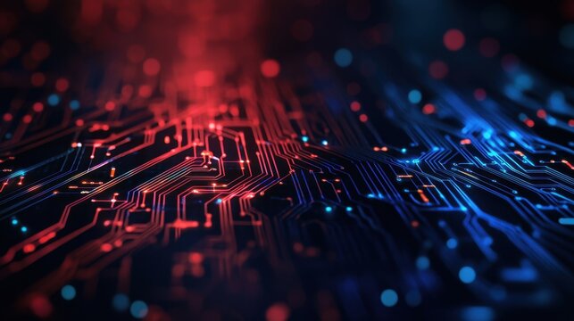 Abstract Digital Circuit Board Background with Red and Blue Glow, Representing Technology, Data Processing, and Cyber Connectivity in a Futuristic Style