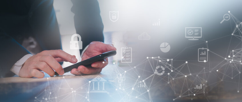 Business man using smartphone with data cloud network and security icons for technology