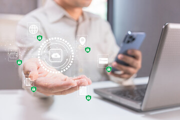 Cybersecurity and privacy concepts to protect data. Businessman use smartphone with cyber security technology for protecting personal data and secure internet access.