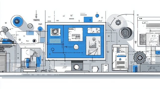 Abstract technology workspace with digital interface and blueprint elements