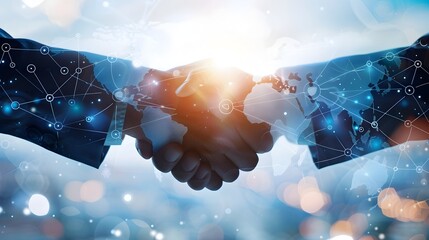 Global Business Professionals Shaking Hands with Digital Network Overlay in Modern Office