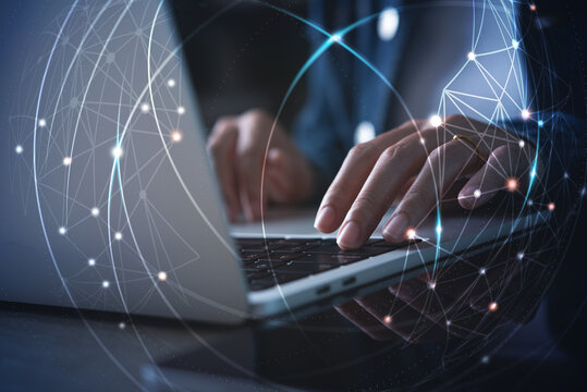Social network connection, internet technology, cloud computing concept. Woman working on laptop computer, technology background