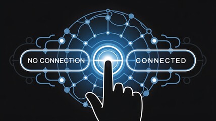 Hand touching a glowing button to connect to a digital network with nodes and lines