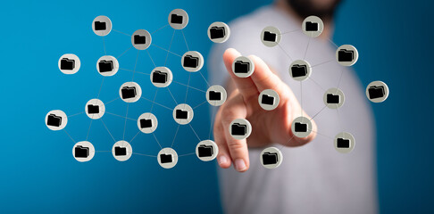 Hand interacting with digital network of folders and connections. Perfect for technology and data concepts. Dig