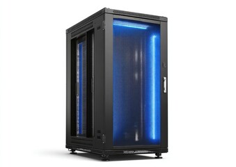 Black server cabinet with blue interior light