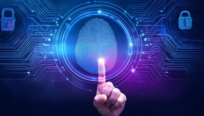 Hand touching a digital screen with icons of technology,  online network connection and the cloud. Finger creating finger print recognition for security.