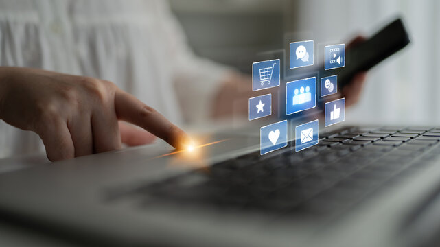 Laptop with glowing global icon surrounded by social media symbols (comment, user, 喇叭,like, heart, camera, image, video) representing international social network, digital media engagement
