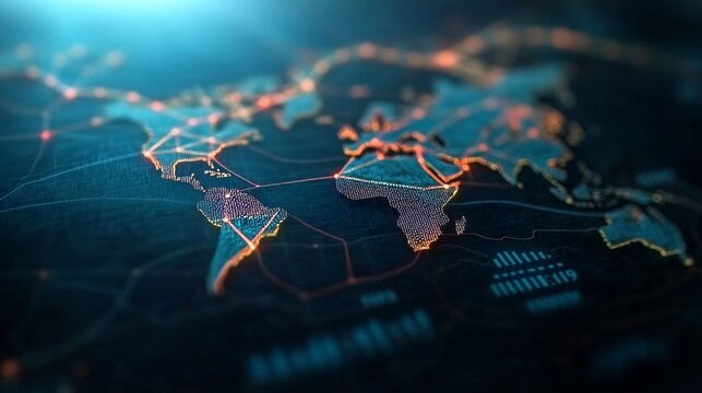 Global Supply Chain Dynamics Visualizing Network Connections Across Continents Digital Map Representation Futuristic Environment Aerial View Innovative Concepts for Business Growth