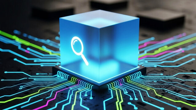 Glowing blue cube with magnifying glass icon on circuit board technology computer