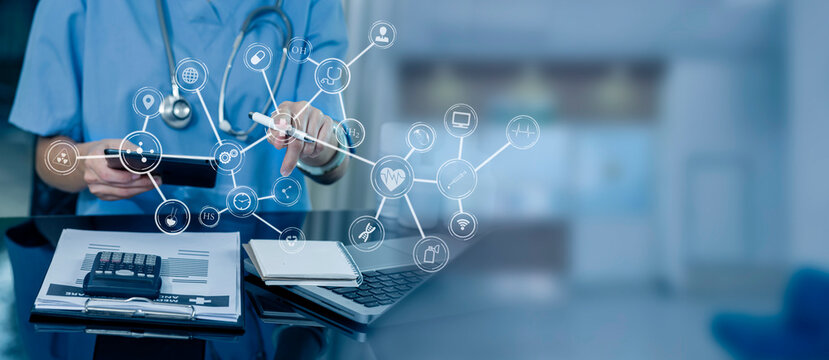 Medicine doctor using digital tablet and smartphone diagnose virtual electronic medical record on interface.Digital healthcare and network on virtual screen