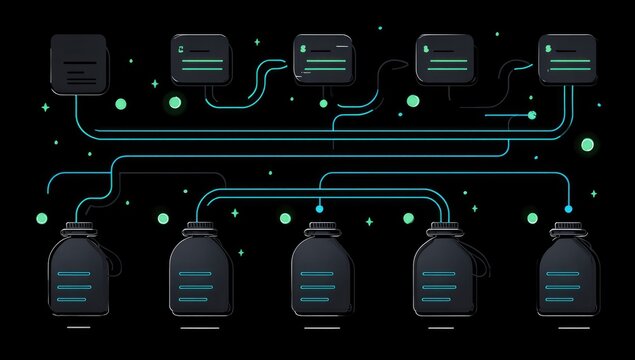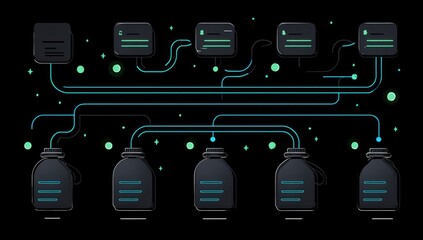 Futuristic digital display showcasing a network of interconnected data streams with glowing blue illumination and concentric circles, forming a complex technological environment with data transfer...