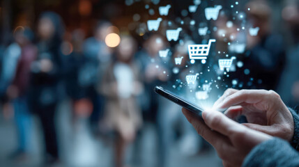 Person using smartphone with glowing shopping cart icons floating upwards representing mobile online shopping in a busy urban environment at night