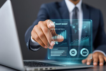 Businessman is using artificial intelligence smart boost growth metrics via futuristic virtual panel floating above laptop, featuring interactive charts, graphs, and percentages