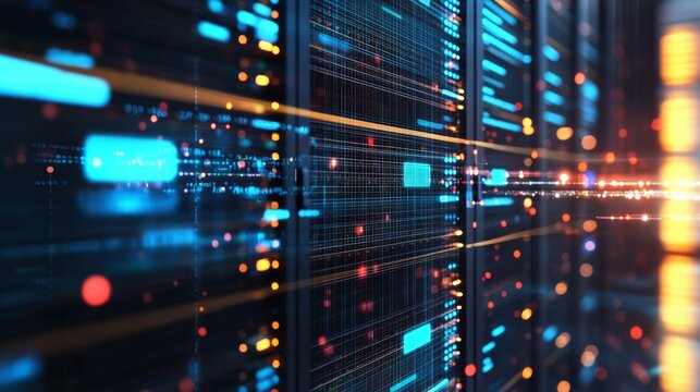Data flow in server room with digital interface overlay
