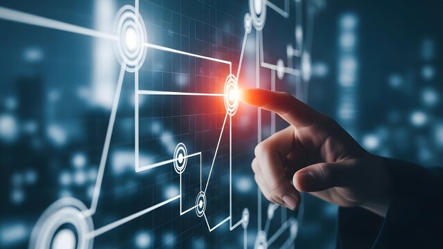Hand interacting with glowing digital network interface technology connection