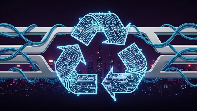 A detailed abstract circuit board with glowing lights, city scape backdrop. Tech illustration representing data flow, perfect for web banner.