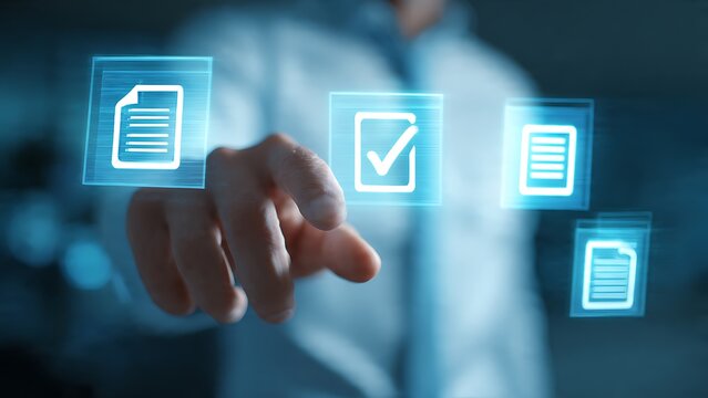 Person's finger touches a glowing digital interface displaying document icons and a checkmark, signifying task completion and digital organization.