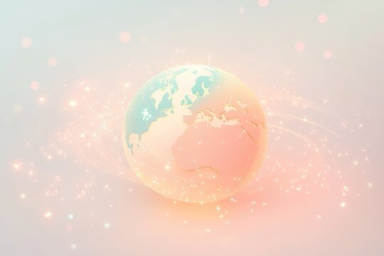 A pastel-colored Earth surrounded by sparkling light trails, suggesting global connection and digital networks.