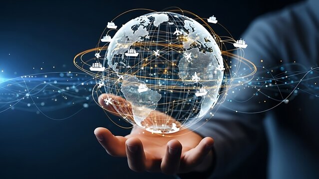 Futuristic digital globe with a vibrant network of interconnected nodes and flowing data particles, representing global communication, advanced technology, and worldwide connectivity
