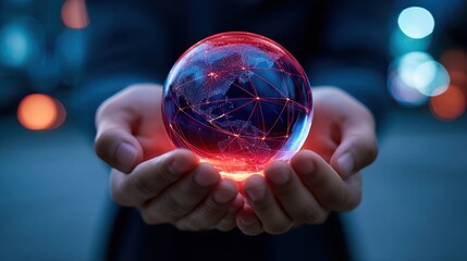 businesswoman’s hand gently holds a glowing globe representing a global network. The sphere symbolizes worldwide connectivity, innovation, and technology in a fast-evolving, interconnected digital wor