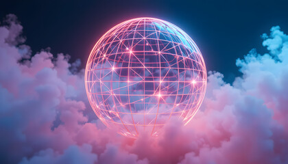 Luminous digital globe network glowing with vibrant neon lights, floating majestically amidst ethereal clouds, symbolizing global connection and futuristic innovation.