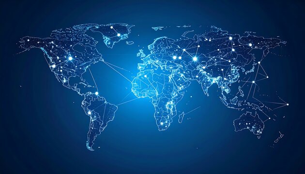 World map glowing with blue light network connections, symbolizing global communication, digital connectivity, technology, and the interconnected future of data and innovation.