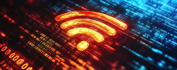 Digital illustration of an abstract wireless network symbol glowing with neon colors amidst swirling data streams