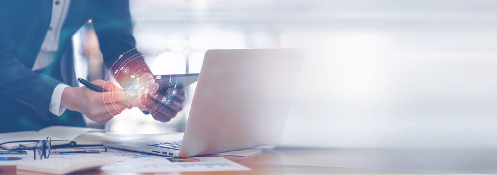 A Businessman working on tablet computer analysis economy finance and sale data growth on interface icons, Banking, Finance, Business Strategy on global business Digital network connection technology.