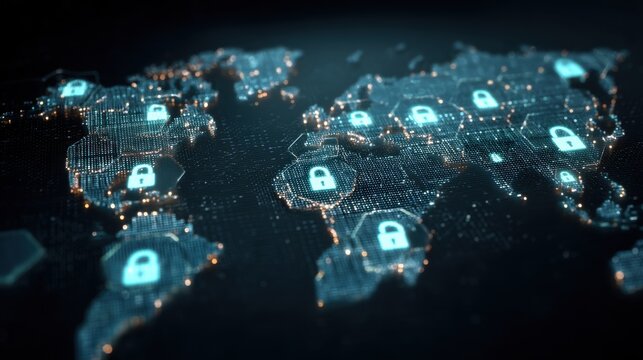 Glowing Hexagonal Map with Padlock Icons Representing Global Security Concepts and Data Protection Strategies