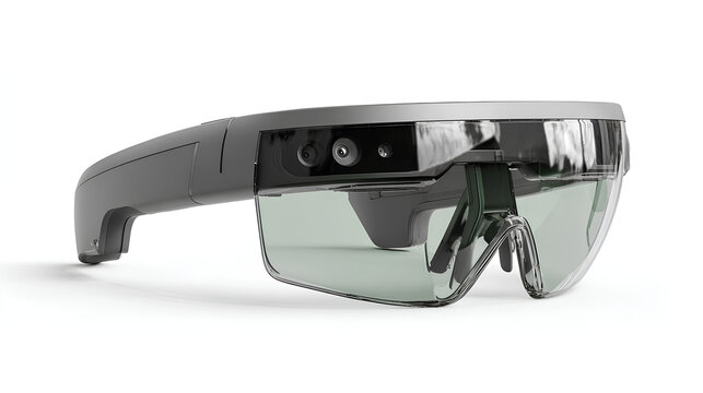 Smart augmented reality glasses on white background, Technological wearable with integrated camera and ergonomic design, Mockup for virtual reality glasses campaign