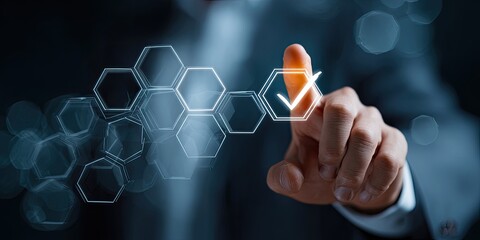 A hand touches a digital checkmark over a network of hexagons