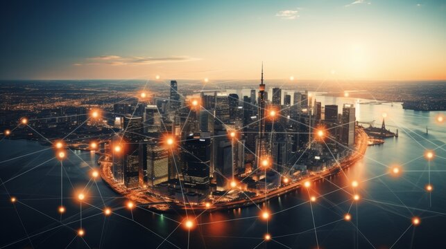 Digital network interface over urban landscape vivid visualization