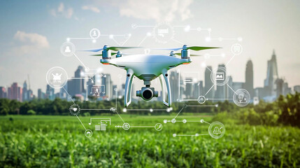 Drone flying over cityscape and farmland with digital icons.