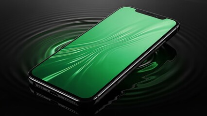 Futuristic Smartphone Display with Green Abstract Light Effects Over Rippling Surface