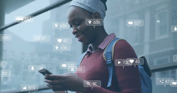 Image of digital icons over woman using smartphone