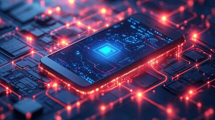 Smartphone on glowing circuit board, intricate details